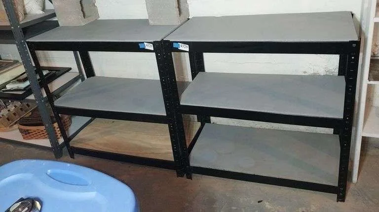 4329 2 black metal shelving units with removable plywood shelves