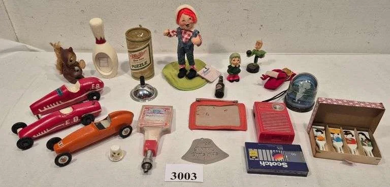 3003 Pinewood Derby cars, figurines, Miller High Life puzzle, transistor radio, plastic snow globe, Budweiser beer tap, Etc
