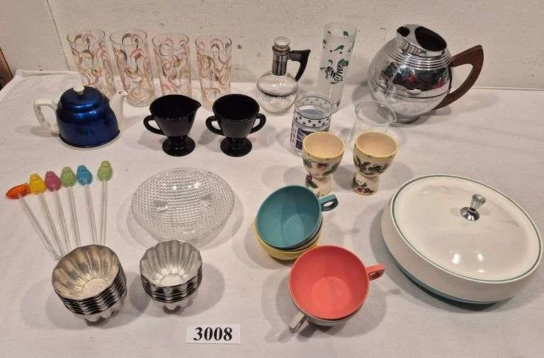 3008 Mid-century drinking glasses, Chrome water pitcher, plastic cups and covered dish, Apollo glass, amethyst glass cream and sugar, Plastics Swizzle sticks, Etc