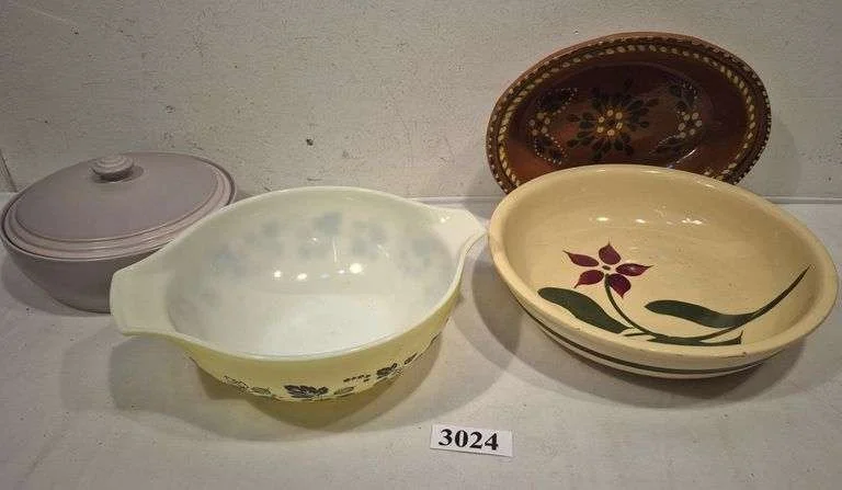 3024 Large vintage yellow Gooseberry Cinderella Pyrex bowl, Watt Pottery spaghetti bowl, pink Pfaltzgraph covered dish, ceramic oval Bowl