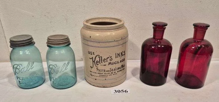 3056 Keller's Inks stoneware crock, two ruby red Pyrex scientific bottles, two Green Ball canning jars with zinc lids
