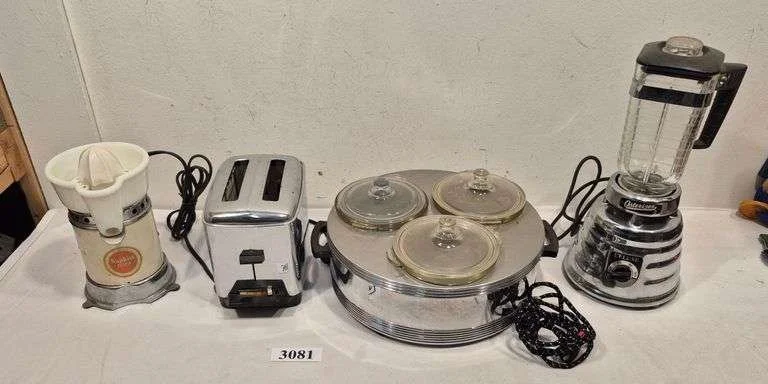 3045 Vintage small appliances including juicerator, two fryers, small hot plates, two coffee percolators