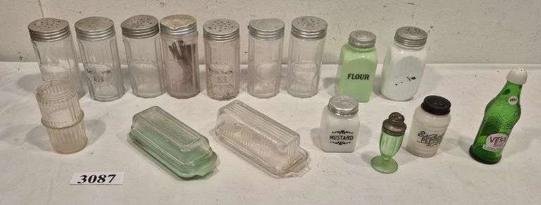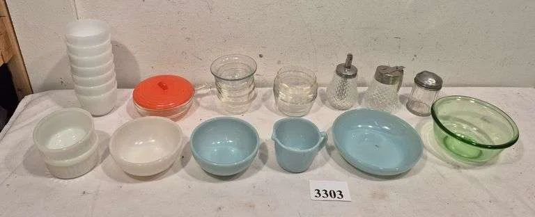 3303 Fire King and other bowls, shaker, syrup, Etc
