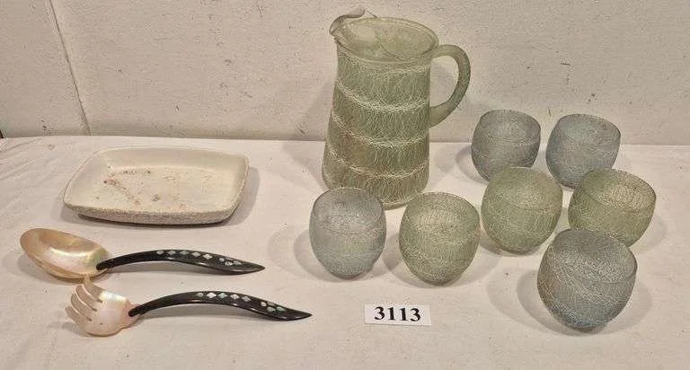 3069 Atlantis Crystal bowl, Beer glasses, jadeite saucer, Corning coffee pot, Etc