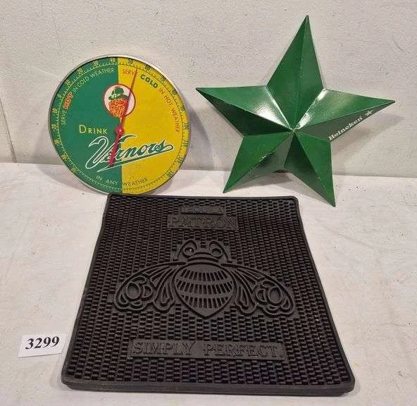 3299 Vernor's thermometer, metal Heineken star beer wall hanging, Patron bar mat