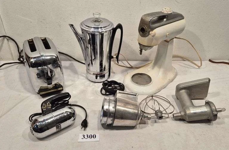 3300 Vintage KitchenAid stand mixer and attachments, coffee percolator, toaster, hair dryer