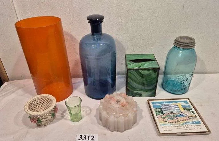 3312 Large Blue Glass bottle, orange glass hurricane shade, canning jar, slag less tissue box, Etc