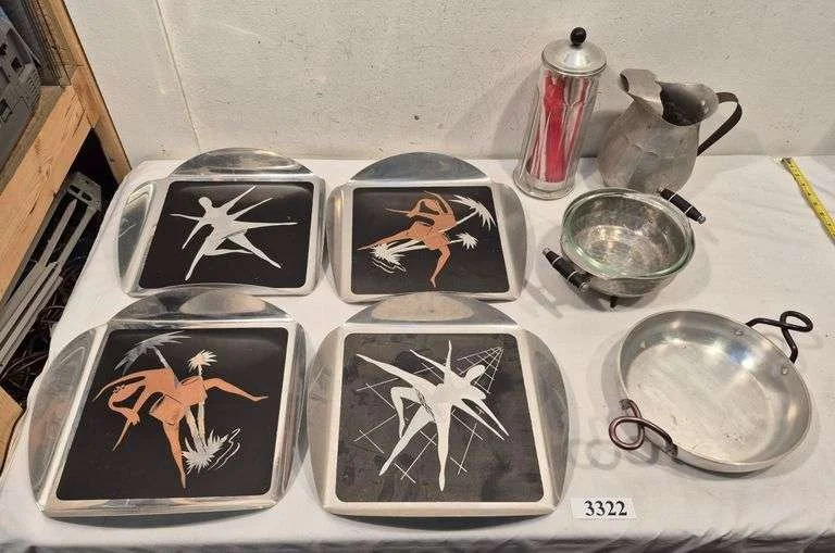 3322 Mid-century trays, straw holder, picture, serving pans