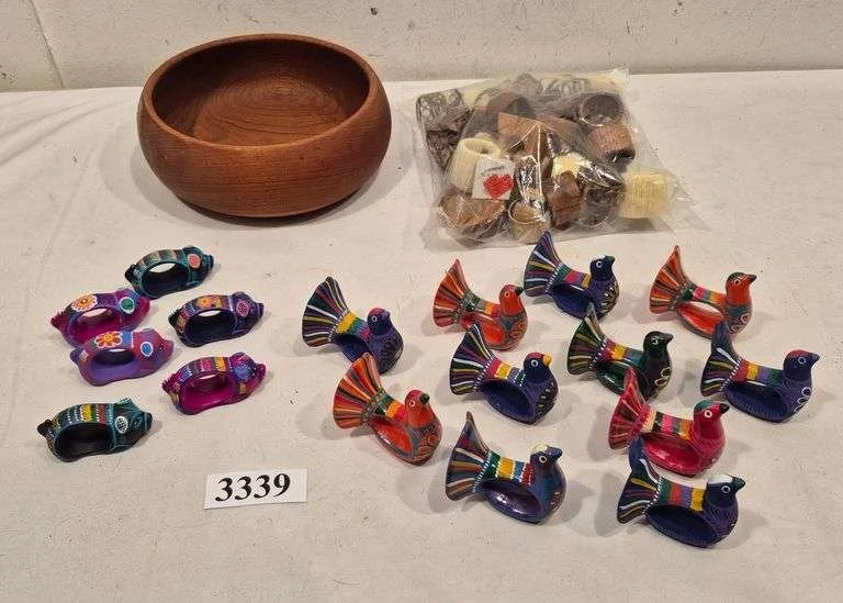 3339 Teak salad bowl, Mexican pottery and other napkin rings