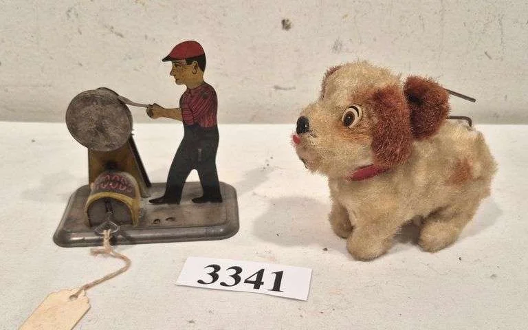 3341 Vintage key wind mechanical woodworker tool and wagging tail dog.