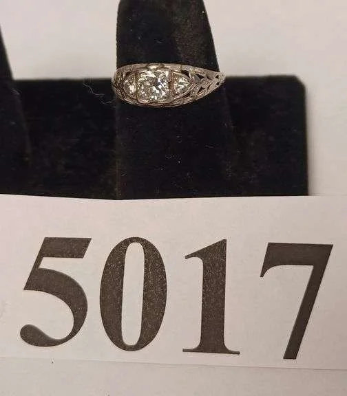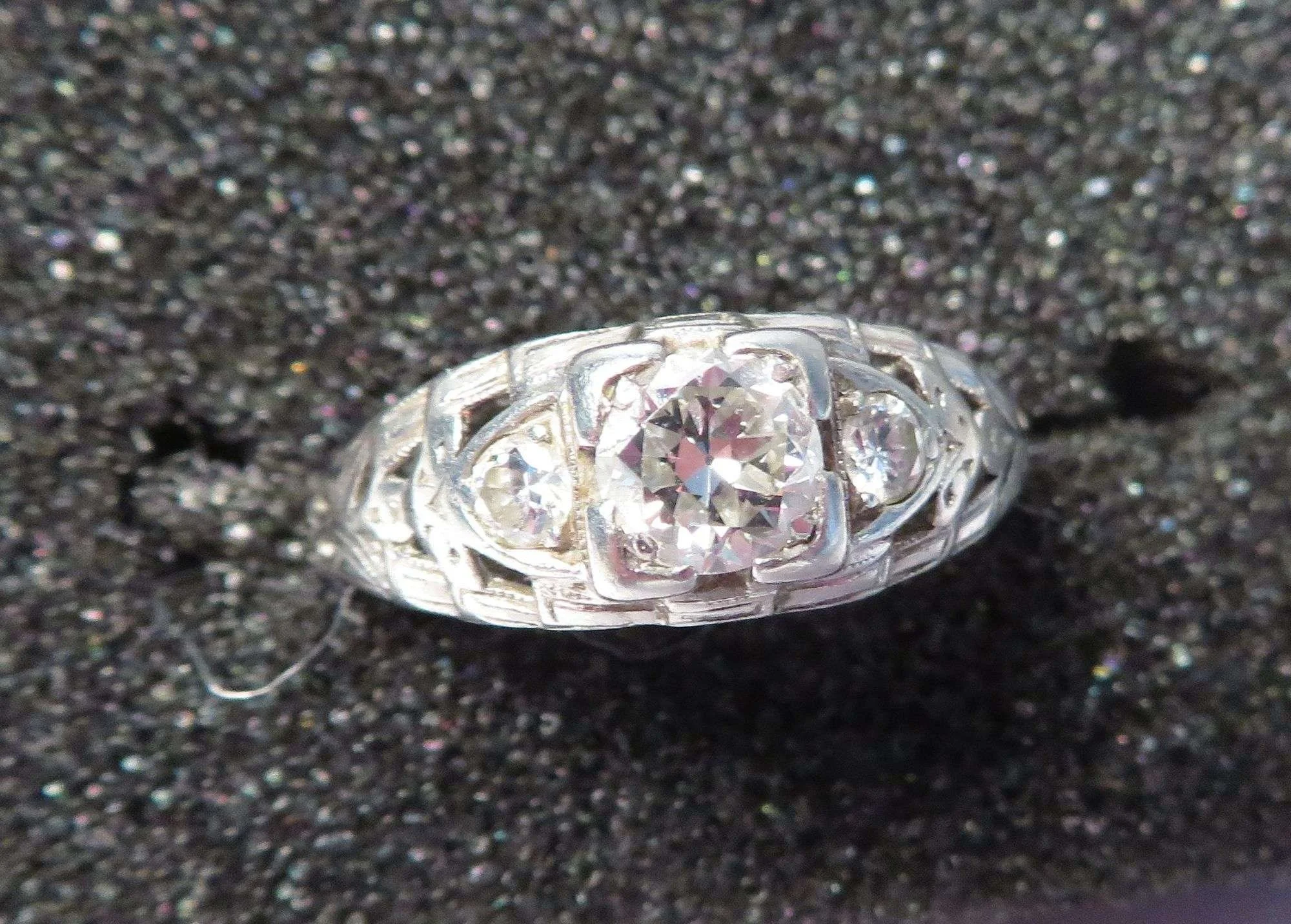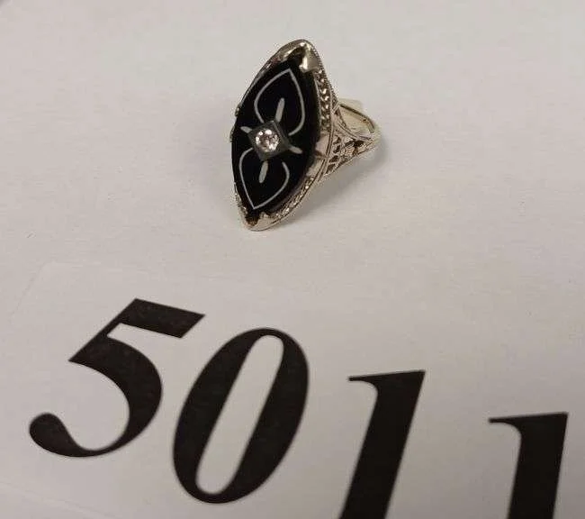 5011 14k white gold antique filigree ring with small diamond set in center of black field.