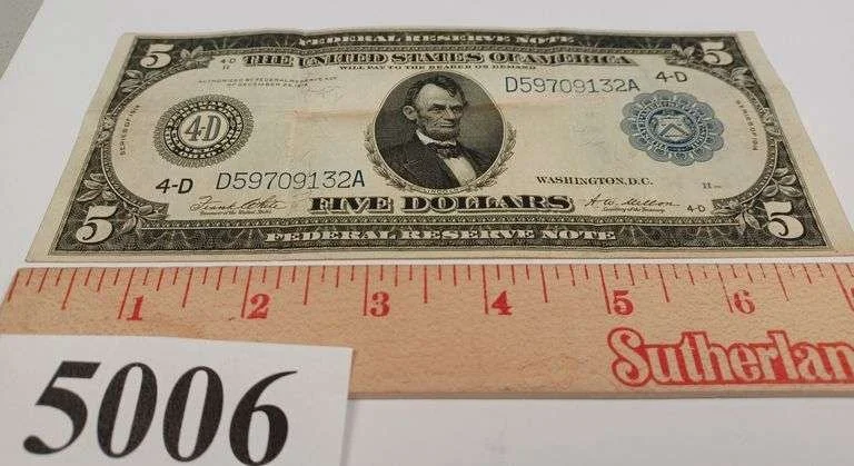 5006 1914 large bill US $5 blue seal Federal Reserve Note