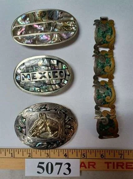 5073 (3) Mexican silver belt buckles with inlay, Mexican silver and copper bracelet with inlay