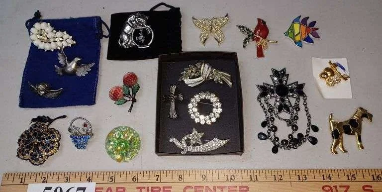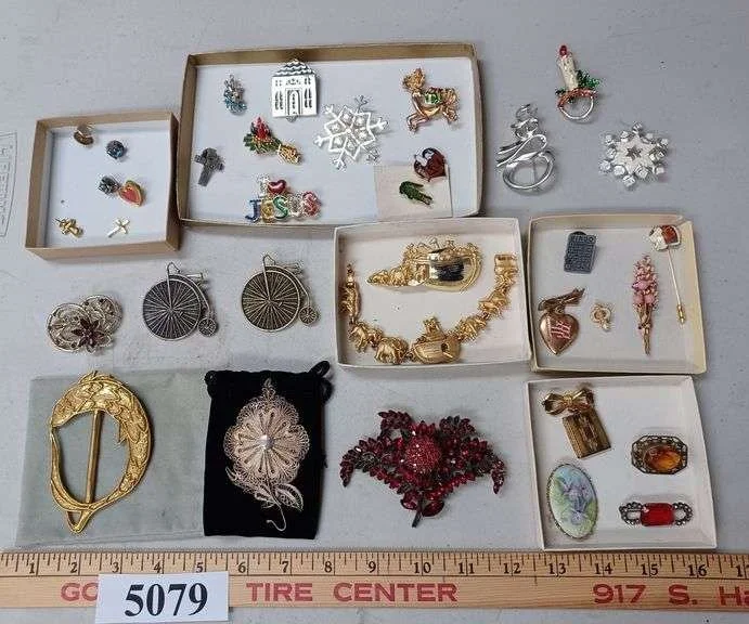 5079 Costume jewelry including pins, brooches, stick pins, Noah's arc pin and bracelet set, etc.