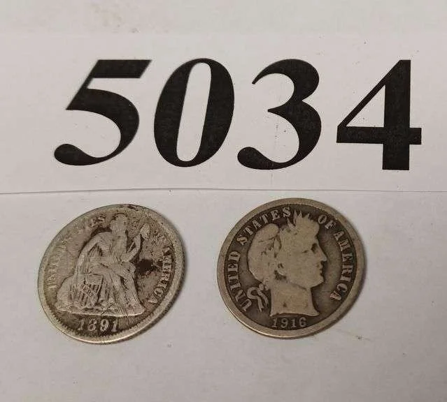 5034 1891 Seated Liberty dime, 1916 Barber dime