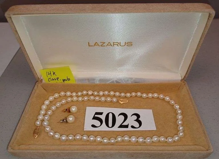 5023 Pearl necklace and earrings with 14k gold clasp and posts