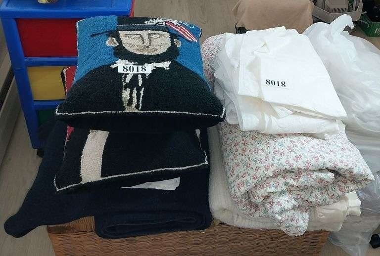 8018 Bedspread, navy wool blanket, George Washington and Abraham Lincoln pillows, blanket and bed pads