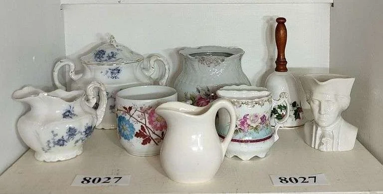 8027 Mustache cups, Christmas bell, mini pitcher, George Washington creamer, creamer and large sugar bowl, etc