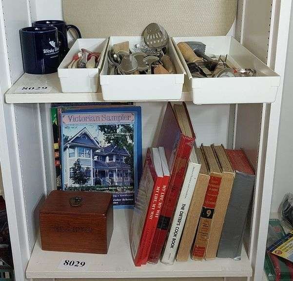 8029 Books, cookbooks, recipe box, kitchen utensils, crochet magazines and instruction booklets, etc