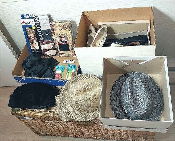 8022 Women's vintage shoes and slip, NIP gloves, scarf and shoe laces, hats