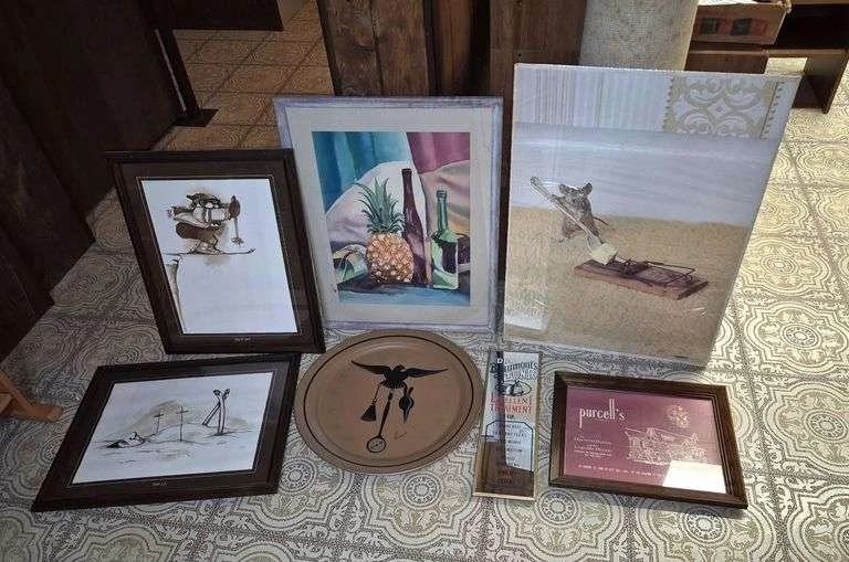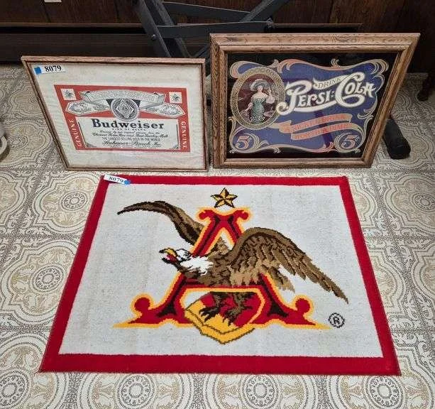 8079 Anheuser Busch rug, framed Budweiser label, reproduction Pepsi sign