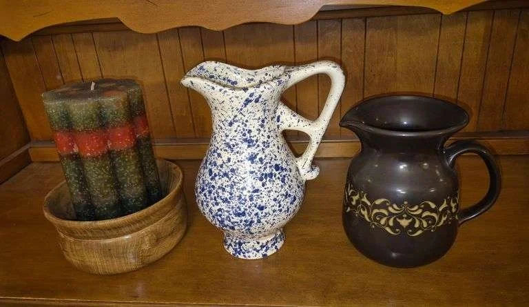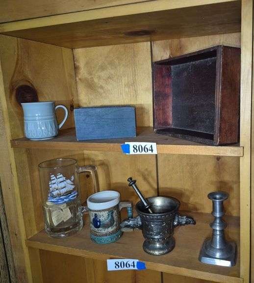 8064 Mortar and pestle, pewter candlestick, mugs, wood organizers, Etc