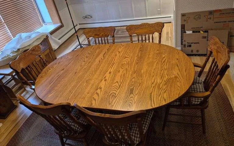 8033 Oak pedestal dining table with two leaves, 6 pressed back dining chairs
