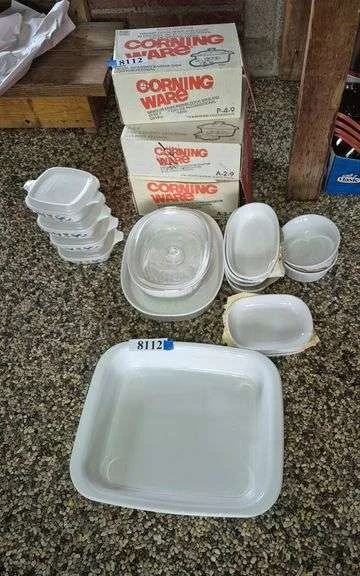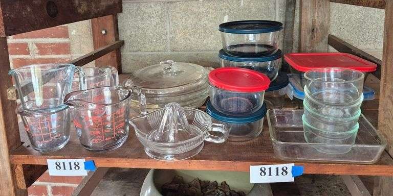8118 Glass food containers, juice reamer, pie plates, Pyrex measuring cups, Etc