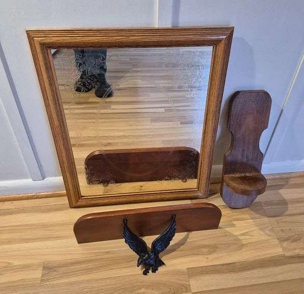 8045 Mirror, cast iron eagle base wall shelf, pine wood candle sconce