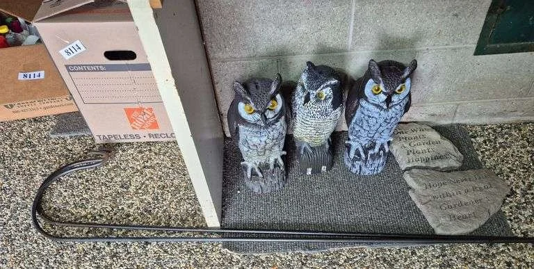 8117 Three plastic scare owls, Stepping Stones with mottos, Shepherd's hooks
