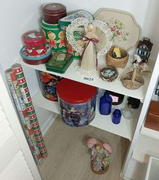 8025 Tins, bottles, resin Angel and rocking horse figurines, wrapping paper, ceramic house tea light holder, Etc