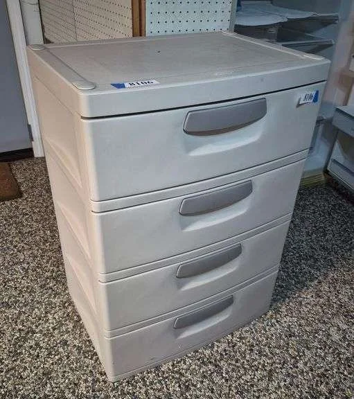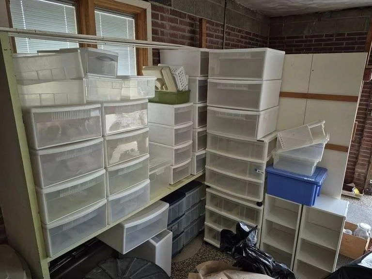 8136 Large lot of plastic drawer organizers, plastic storage totes, too small white laminate shelves