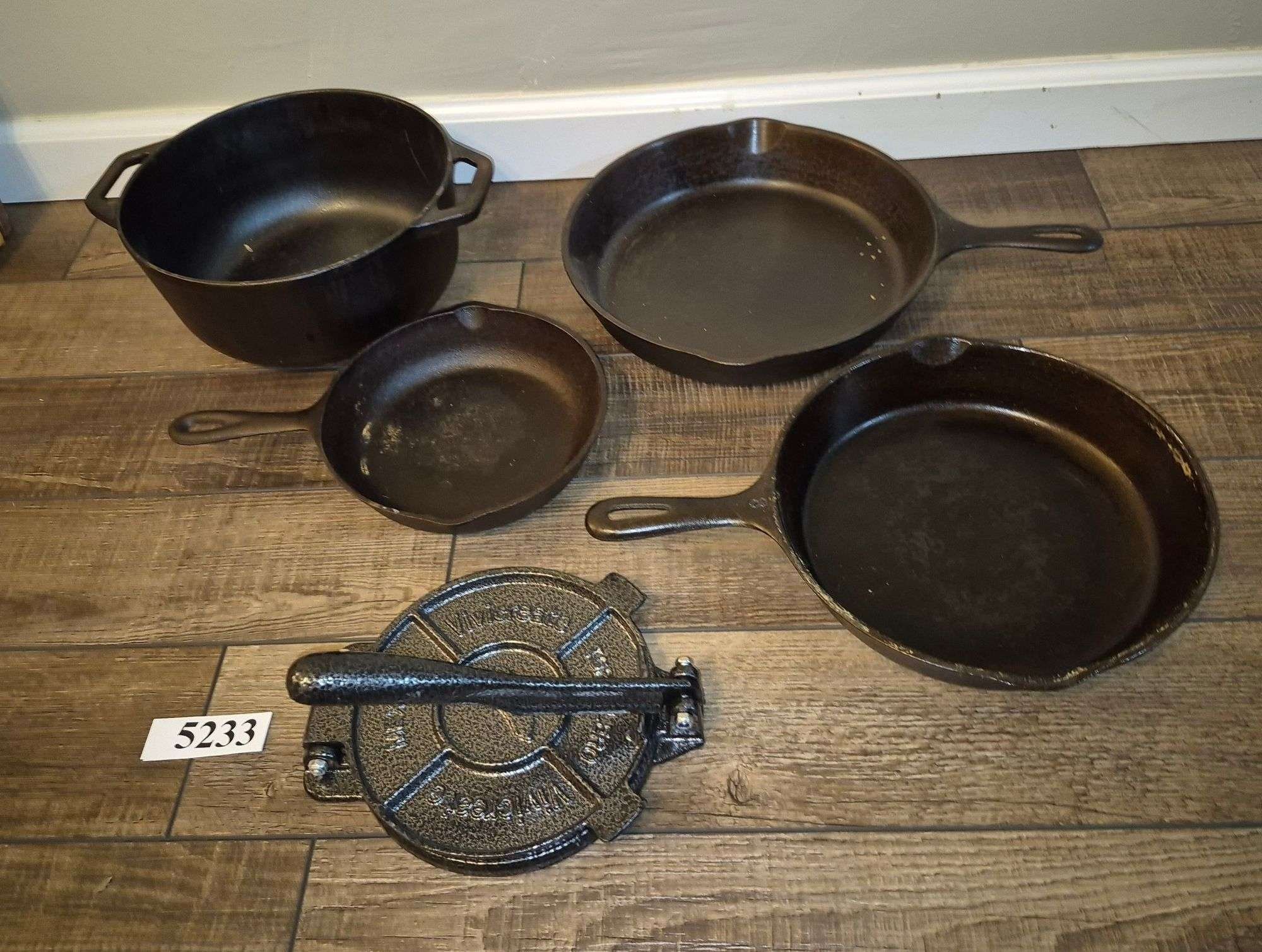 5233 Cast iron skillets, pan, press