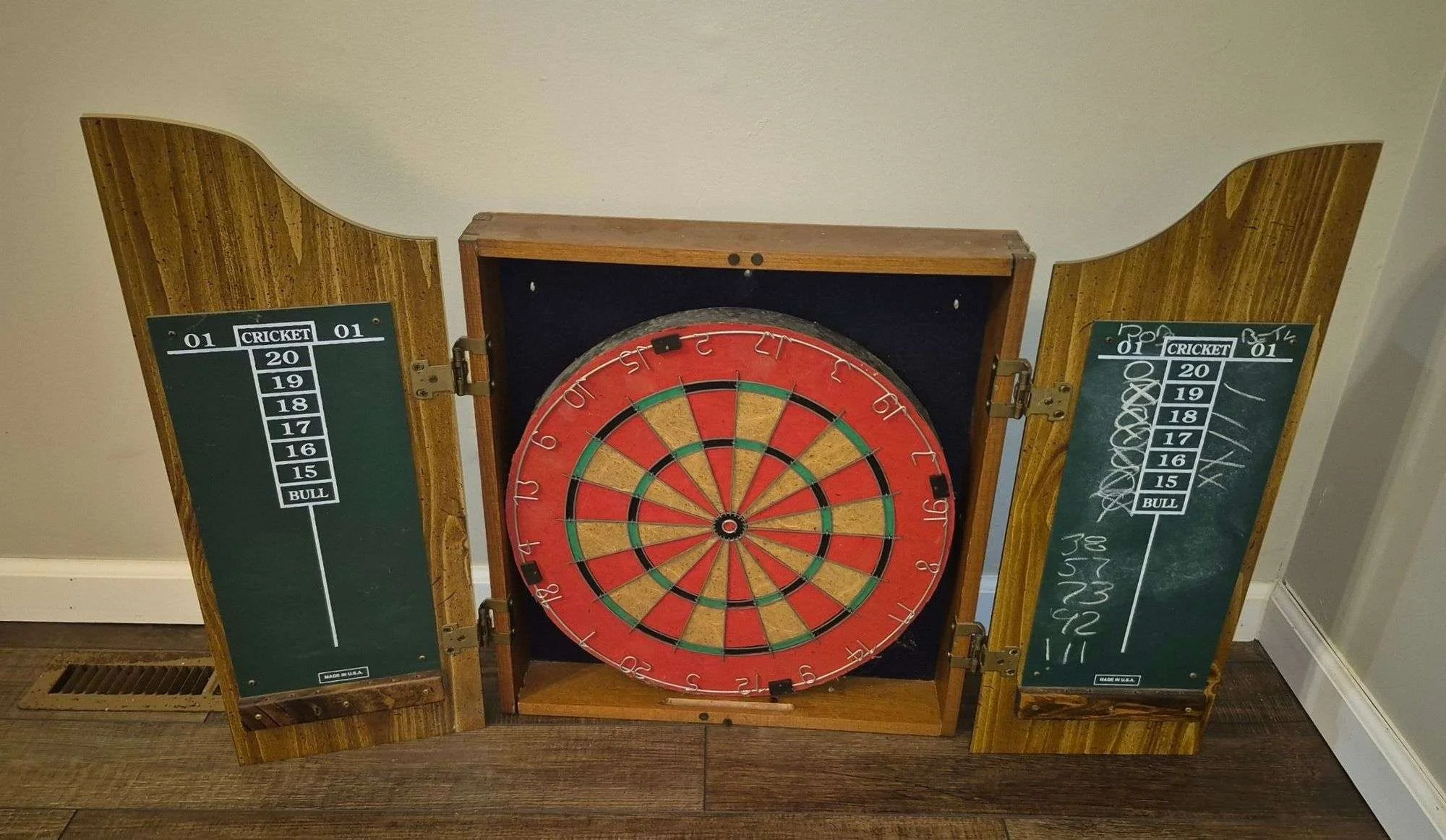 5223 Dart board in wood wall hanging cabinet with various darts and accessories