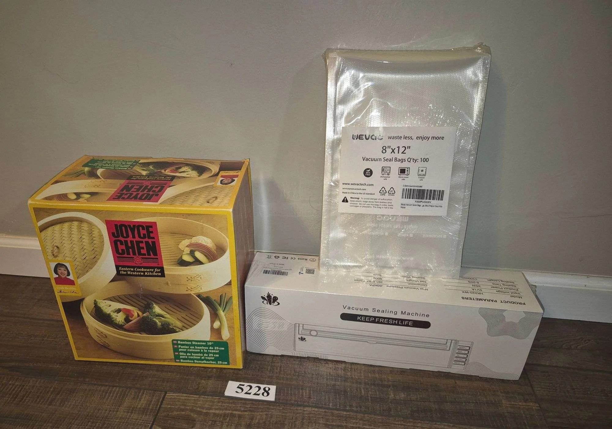 5228 Vacuum sealing machine with bags, Joyce Chen bamboo cookware in box