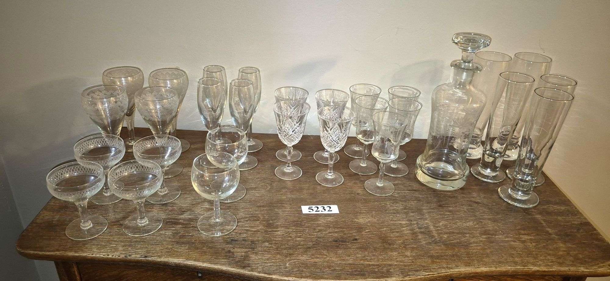 5232 Stemware, etched glass decanter and matching stems, pilsner glasses, Etc