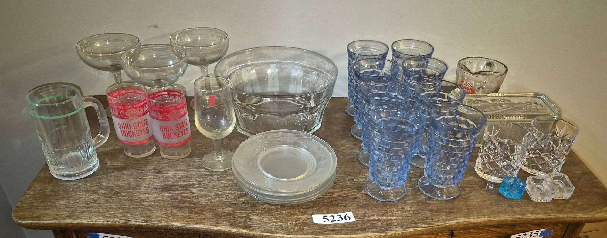 5236 Ohio State glasses, blue footed tumblers, refrigerator dish, individual salt dips, large glass bowl, etched plates, Etc