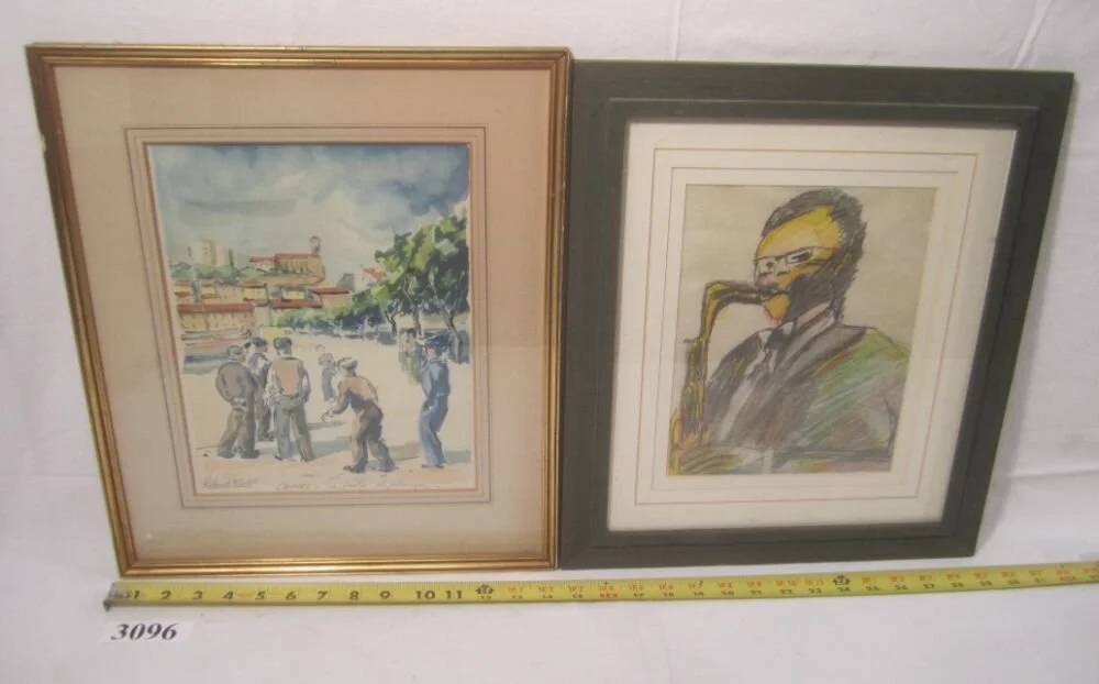 3096. Framed signed watercolor by Roland Atlan, original framed (colored pencil?) drawing of saxophonist