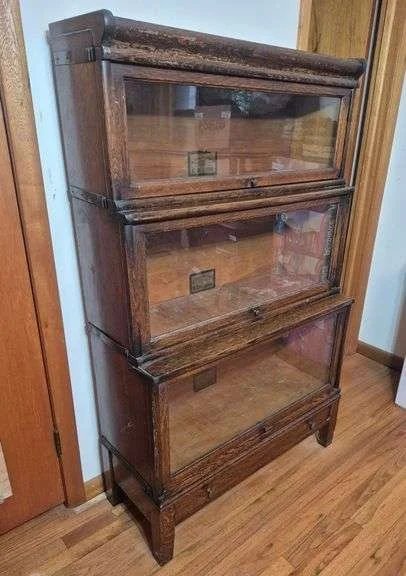 2059 Antique oak Globe-Wernicke three-section stepped Barrister bookcase with one drawer base and Crown