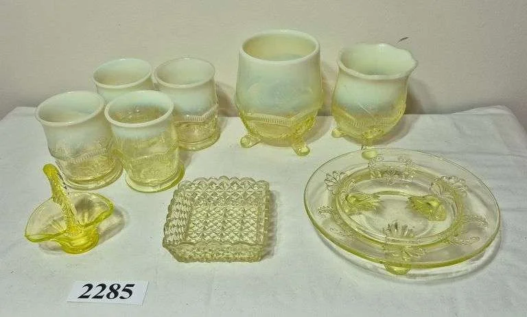 2285 Uranium glass / Vaseline Glass cups, footed vases, Square bowl, small glass basket, butter dish base