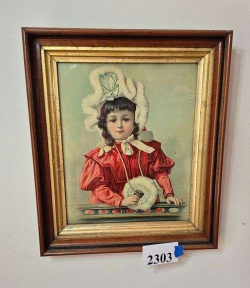 2303 Antique girl in Christmas outfit print in deep Walnut antique frame with original wavy glass