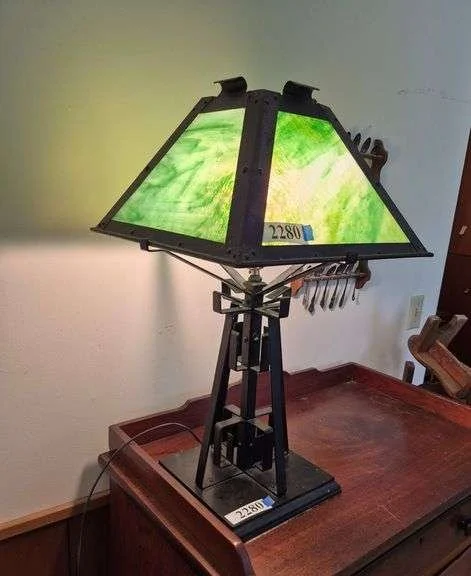 2280 Black metal lamp with green slag glass shade, wood base