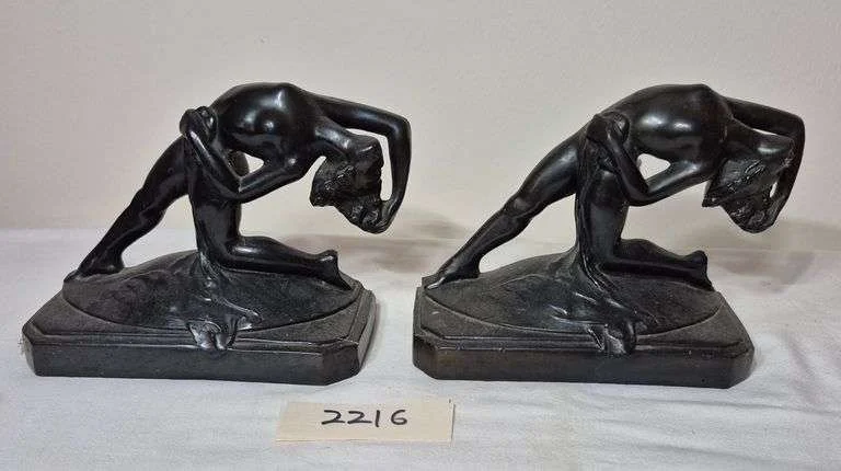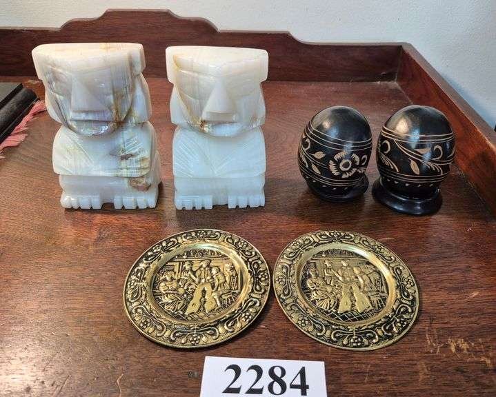 2284 Pair of carved Alabaster bookends, pair of very small brass plate wall hangings, pair of carved gourds?