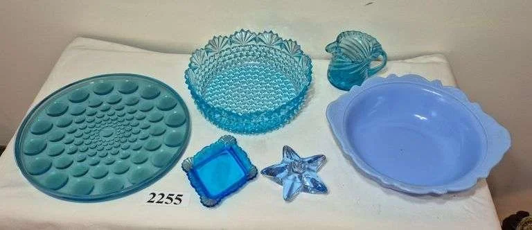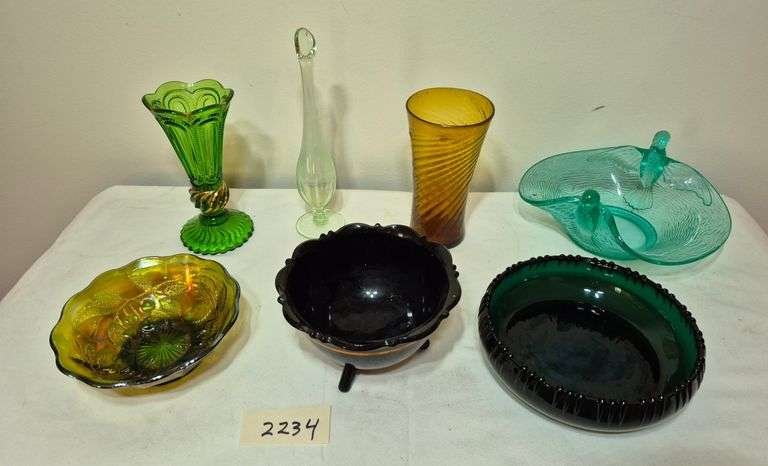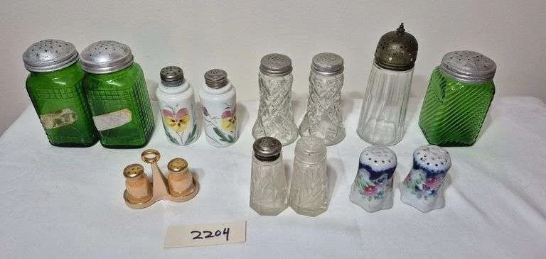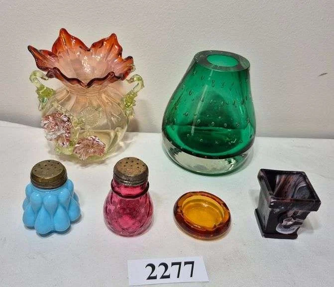 2277 Antique cranberry and blue satin glass shakers, slag glass toothpick, single green bubble Ericsson bookend vase, antique uranium art glass vase, etc.