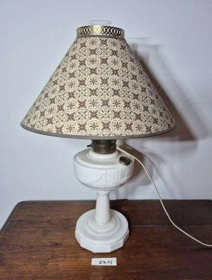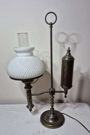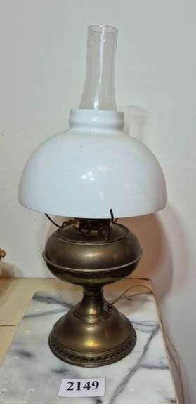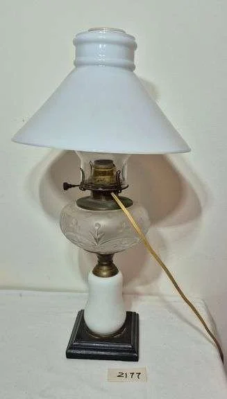 2012 Electrified ceiling hanging oil lamp with milk glass globe