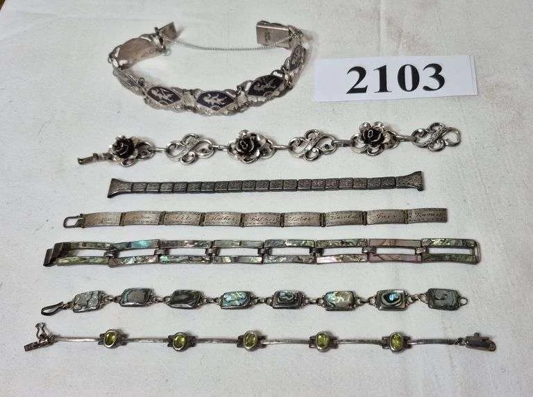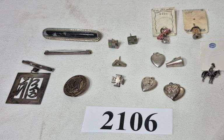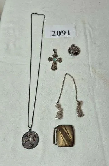 2091 Sterling Silver necklace with pendant, two pendants, bunny sweater clip, belt buckle