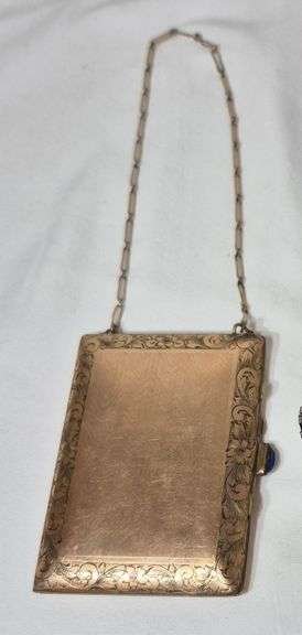 2013 Antique compact with chain marked "solid gold shell"