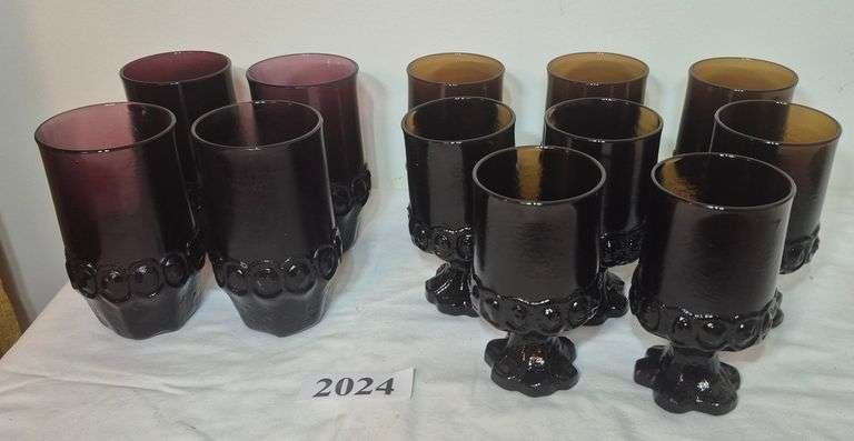 2024 Mid-century purple glass drinking glasses and brown glass footed glasses / goblets