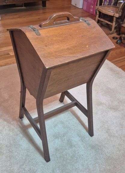 2053 Wood floor standing sewing box, sewing notions, Etc