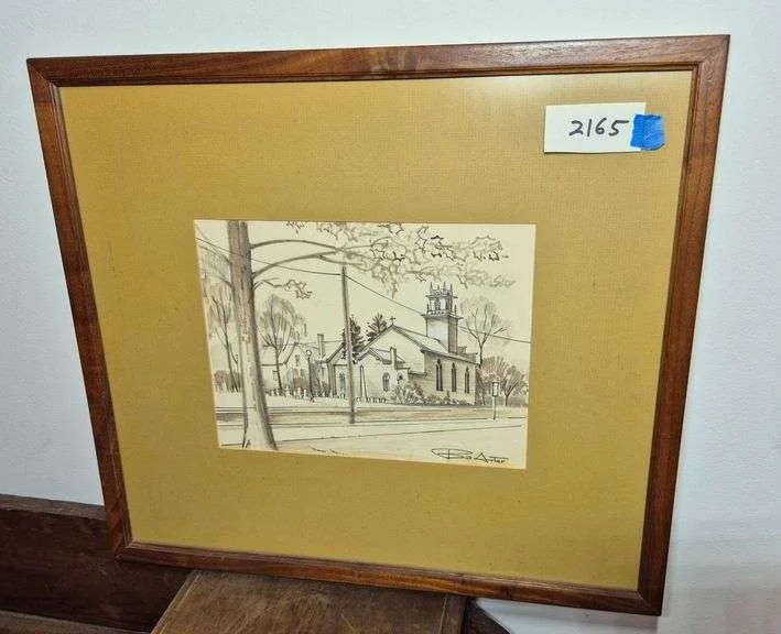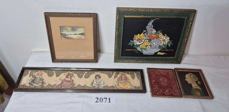 2071 Small framed painting, framed prints, print in tin type case